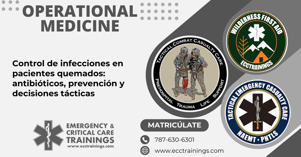 Basado en el nuevo Burn Care CPG 2025 del Joint Trauma System (JTS), este blogpost explica cómo prevenir, identificar y tratar infecciones en pacientes con quemaduras, y cómo aplicar estos conocimientos en el terreno. A lo largo del artículo, se enlazan los aprendizajes con las experiencias formativas en los cursos de Prehospital Trauma Life Support (PHTLS) y Tactical Combat Casualty Care (TCCC) ofrecidos por ECCtrainings.